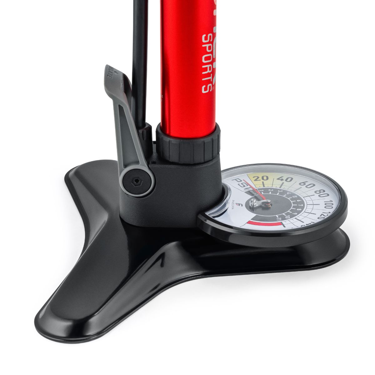 • Use as a charging pump to seat tubeless tires by pressurizing the hidden air tank when the foot lever is down, then flip the foot lever for a burst of high-pressure air.