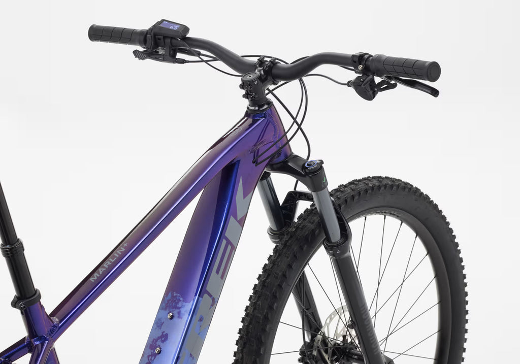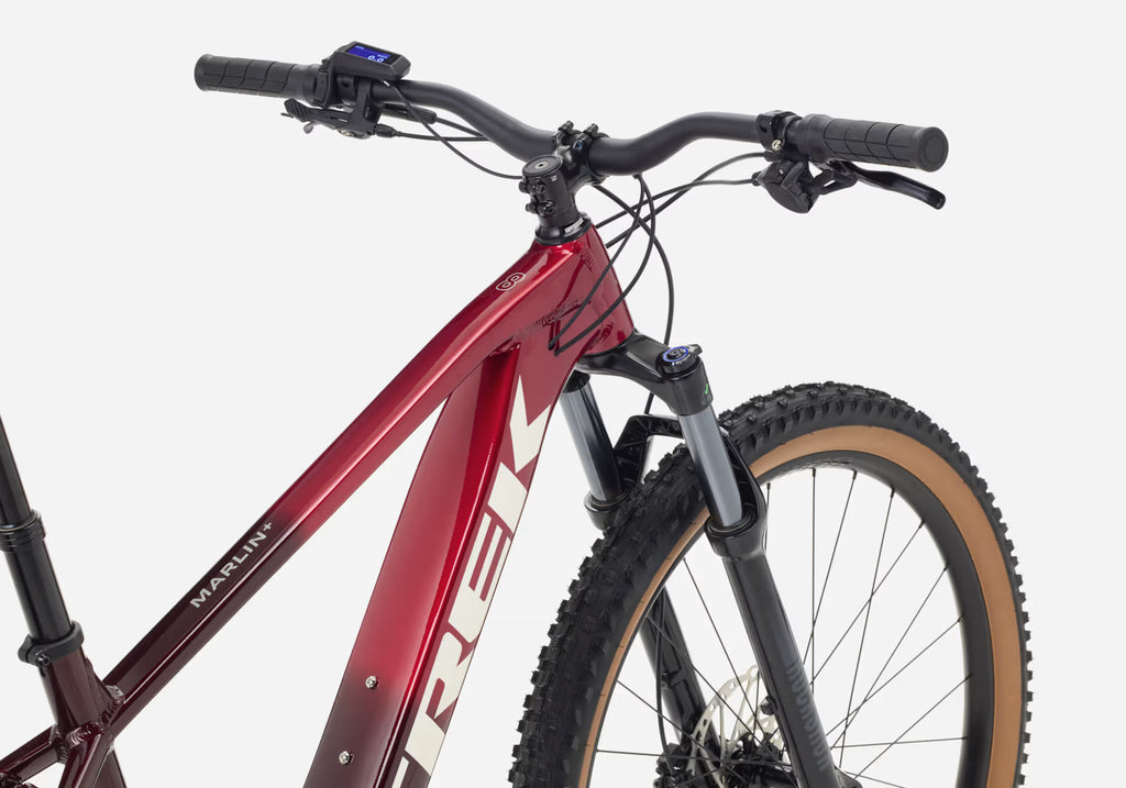 The Marlin+ 8 is an electric mountain bike that's ready to up your game on the trail. Its Bosch Active Line Plus motor gives you just the boost you need for getting up steep climbs and riding further, and doesn't break the bank, and a 120 mm suspension fork keeps handling smooth through the rough stuff. Upgraded components, like wide tubeless-ready wheels and tyres and a 12-speed Shimano drivetrain make this a trail-savvy ride that's ready to go anywhere