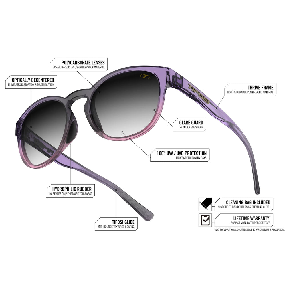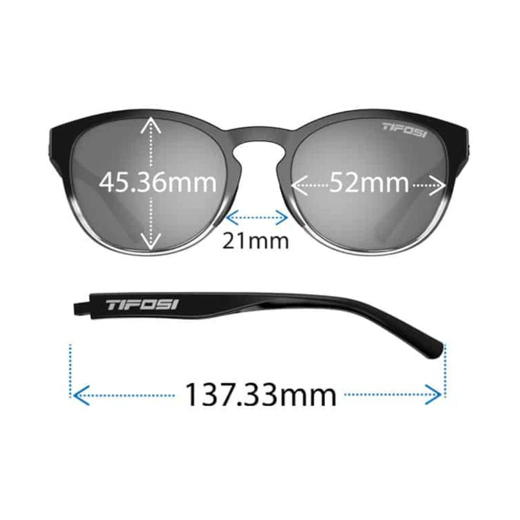 • Features: Integrated hinge never pulls hair, hydrophilic nose pads for increased gripping, and Tifosi Glide technology allows the frame to slide on comfortably and provide a no-slip fit