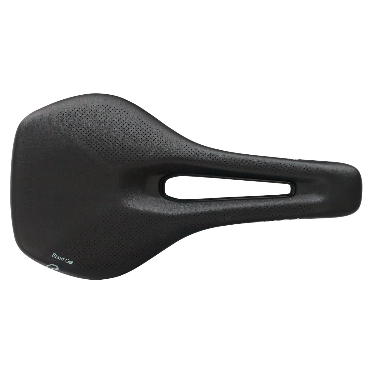 The gel road bike saddle for women. The shape and relief fits the female anatomy perfectly in the typical, bent forward sitting position. Supportive yet comfortably upholstered with natively pressure relief with a tapered cutout and strategically placed gel pad inlays all the way towards the nose of the saddle.