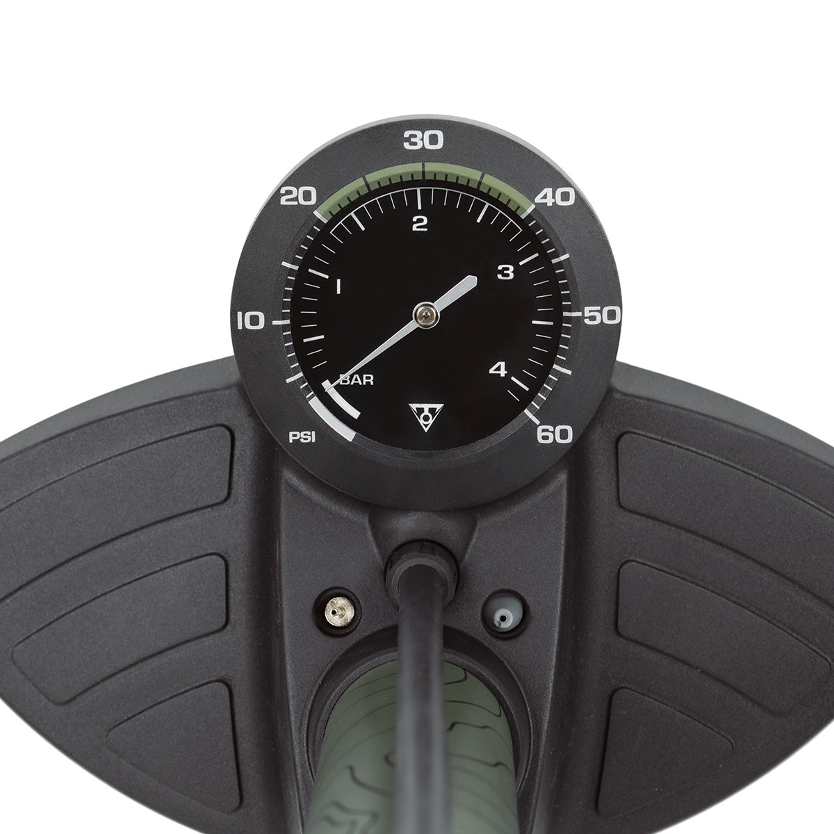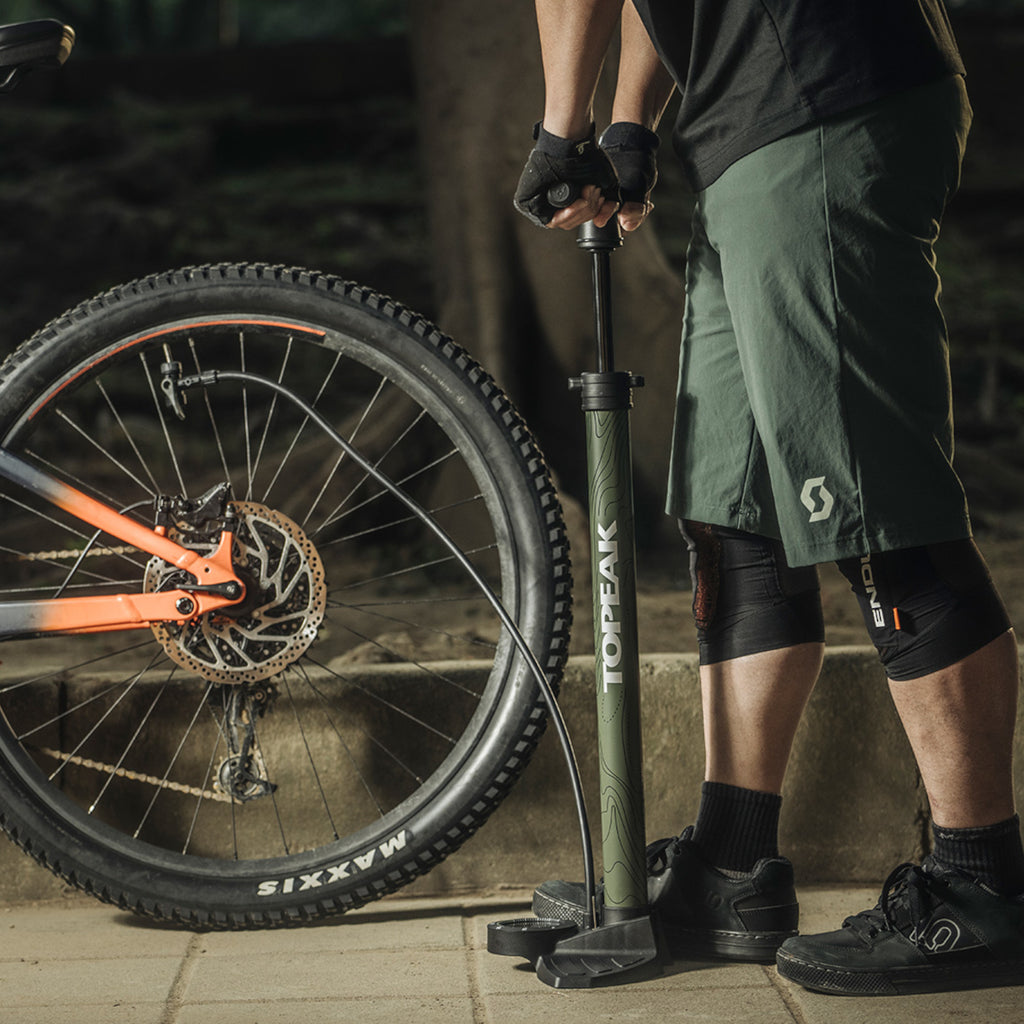 This unique mountain bike specific floor pump features a super-sized barrel that inflates tubes nearly 50% faster than normal floor pumps. It delivers the higher volume required for large off-road tires and a large 3.5" easy-to-read base-mounted analog gauge with air release button to help dial in the proper pressure.