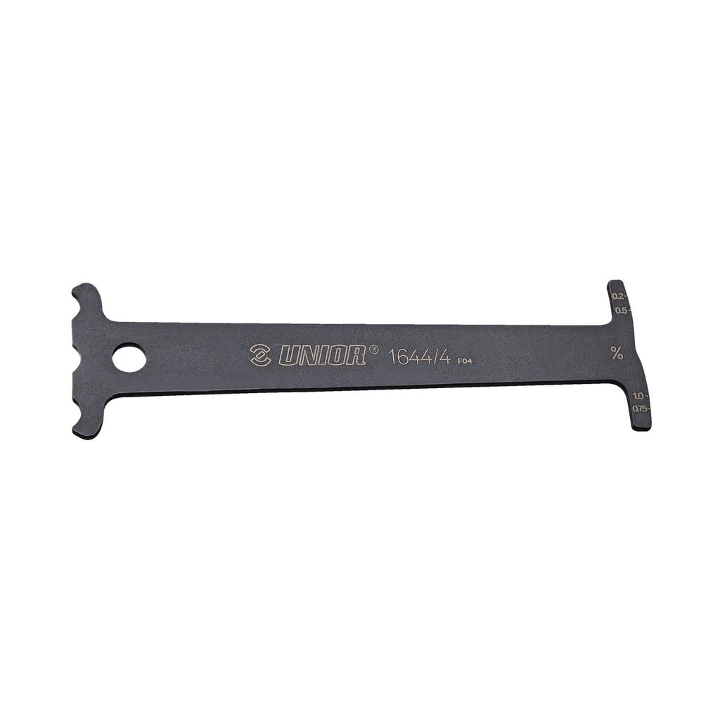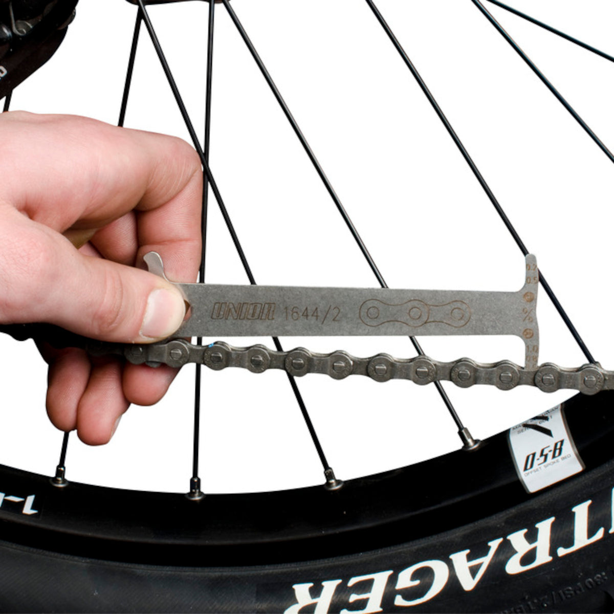 A worn chain shifts poorly and causes undue damage to the sprockets. This tool is a "go, no go" gauge designed to accurately indicate when a chain is worn out.