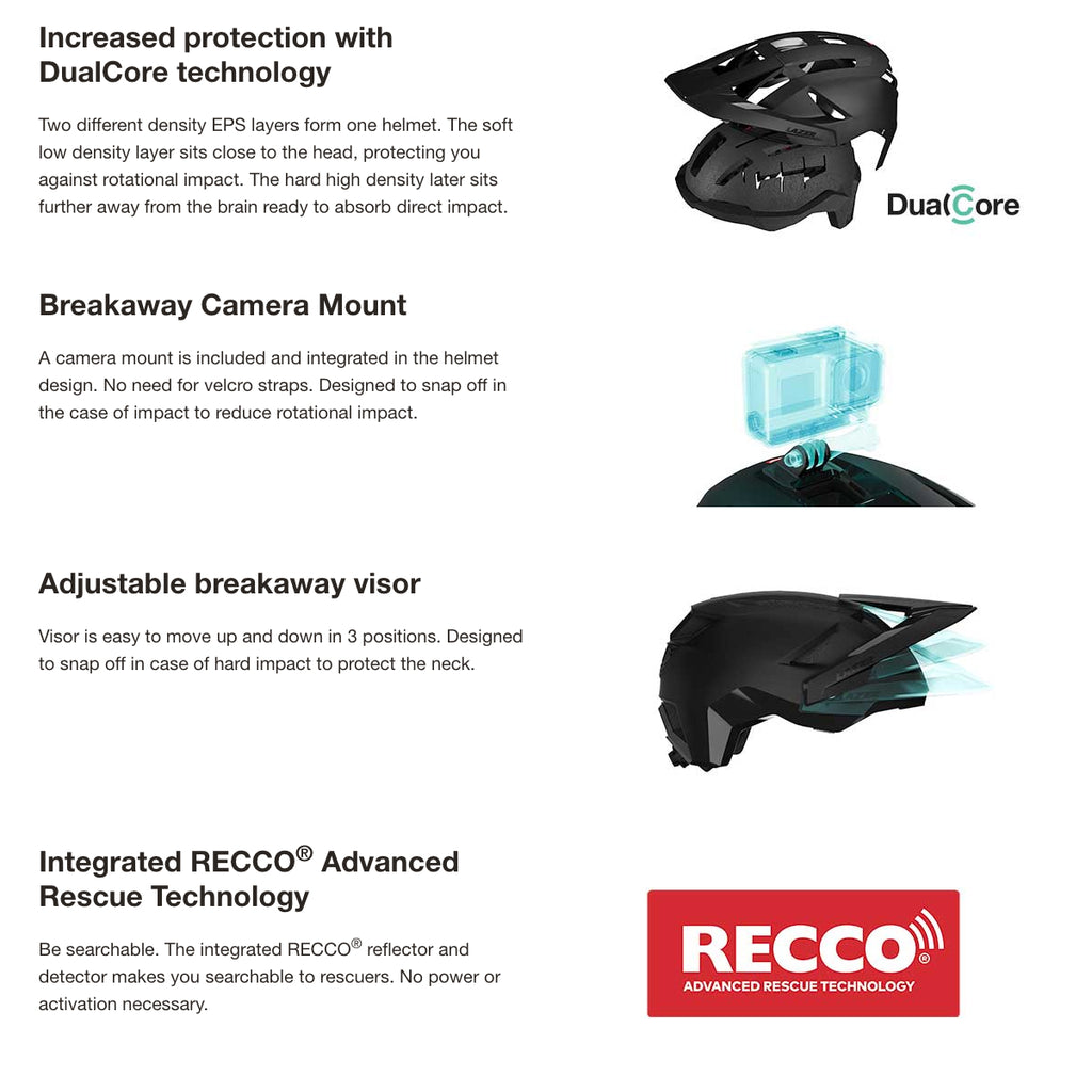 This premium helmet is packed with features to prioritize safety and comfort of the user, such as a breakaway visor, built-in breakaway camera mount, and Recco Rescue Technology. This feature-loaded helmet is perfect for those who want to test their limits.