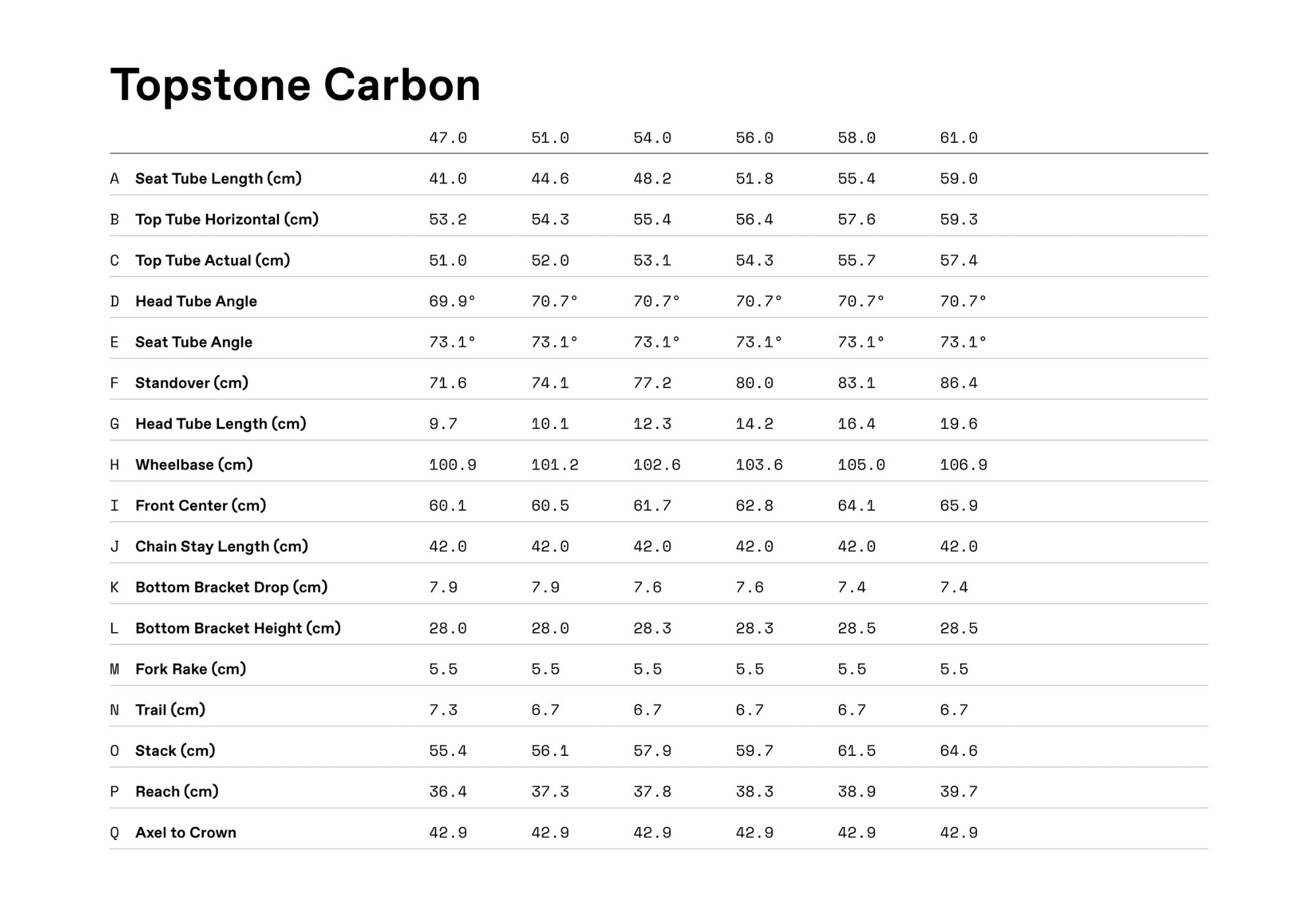 Topstone Carbon, 1-1/8" to 1.5" steerer, 55mm OutFront offset, flat mount disc, internal routing, 12x100 thru-axle, triple bottle/gear mounts, fender mounts